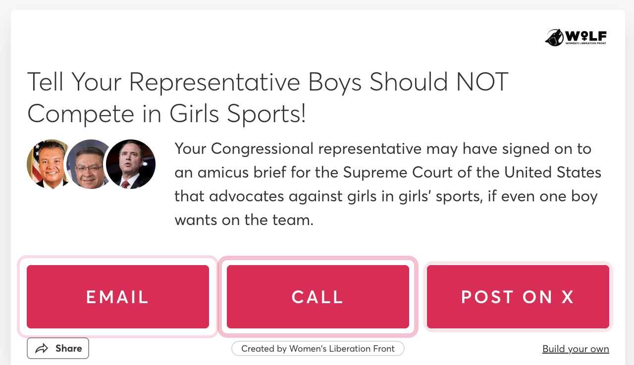 Did your representative sign on to the amicus brief in support of boys competing in girls’ sports? Let them know how you feel! Click below to contact your representative (only for the states where a representative signed on to the brief):